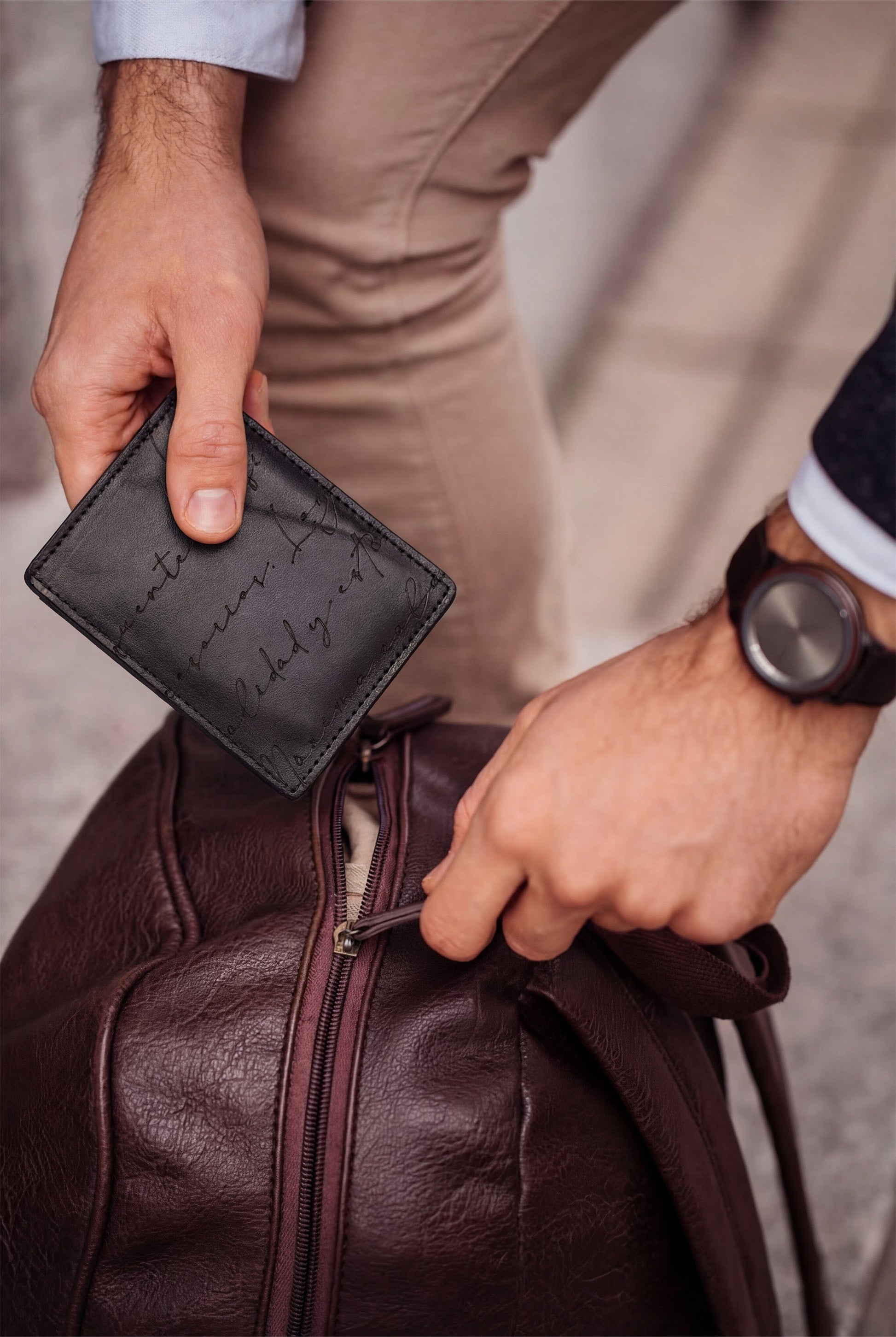 Black in color is a premium card holder made from cow crust leather with detailed laser engraving and a hand-painted finish. This practical card holder has a slim, smart profile with 8 pockets for everyday use.