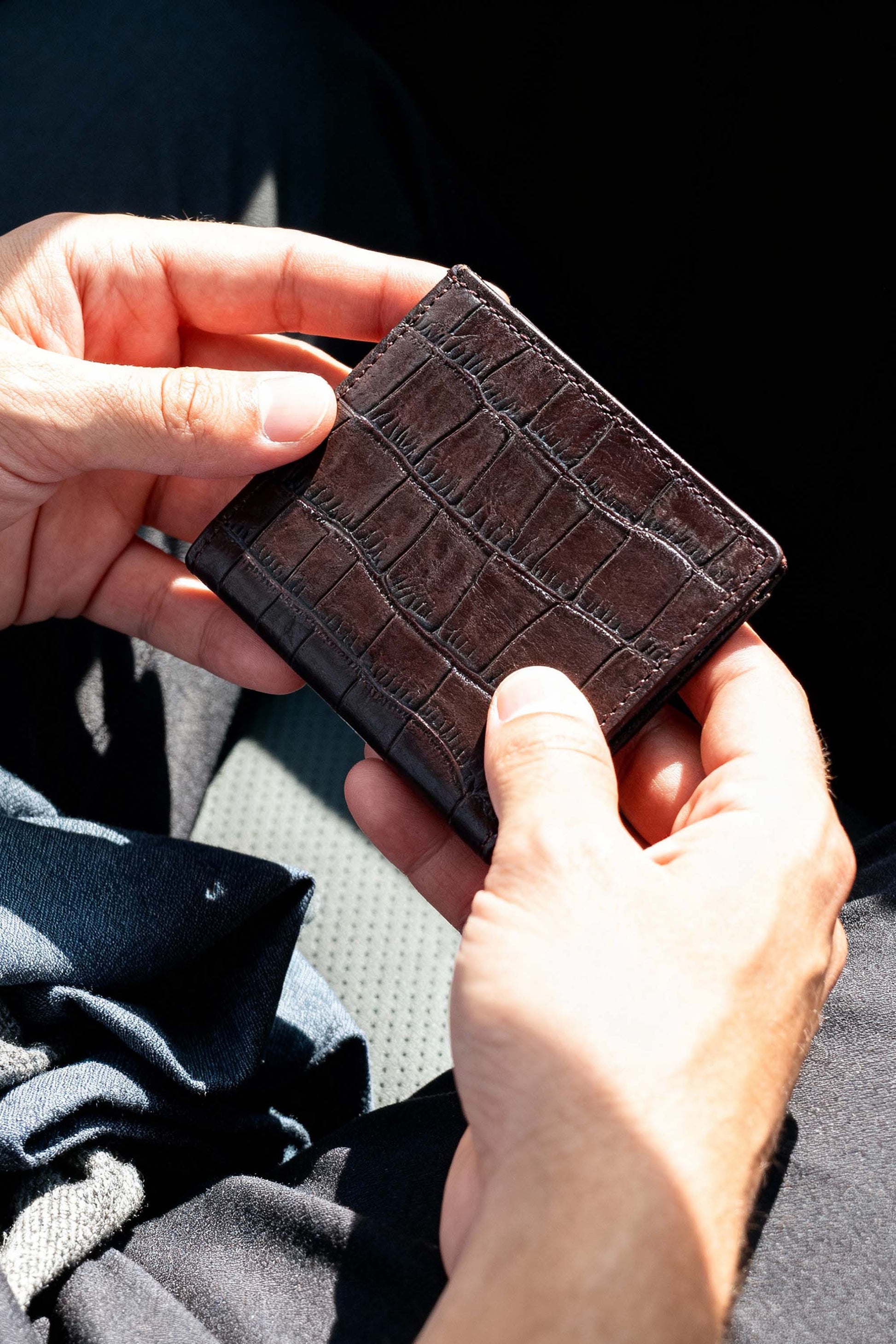 This chocolate brown note wallet has a modern design. This durable note wallet is made from crocodile-textured, cow leather. It offers a bold and premium look which is ideal for everyday use with a refined finish.